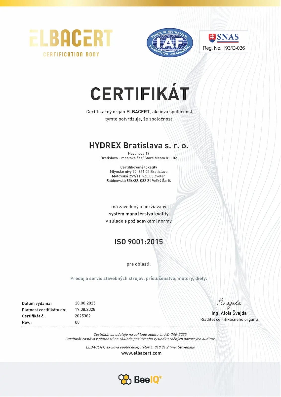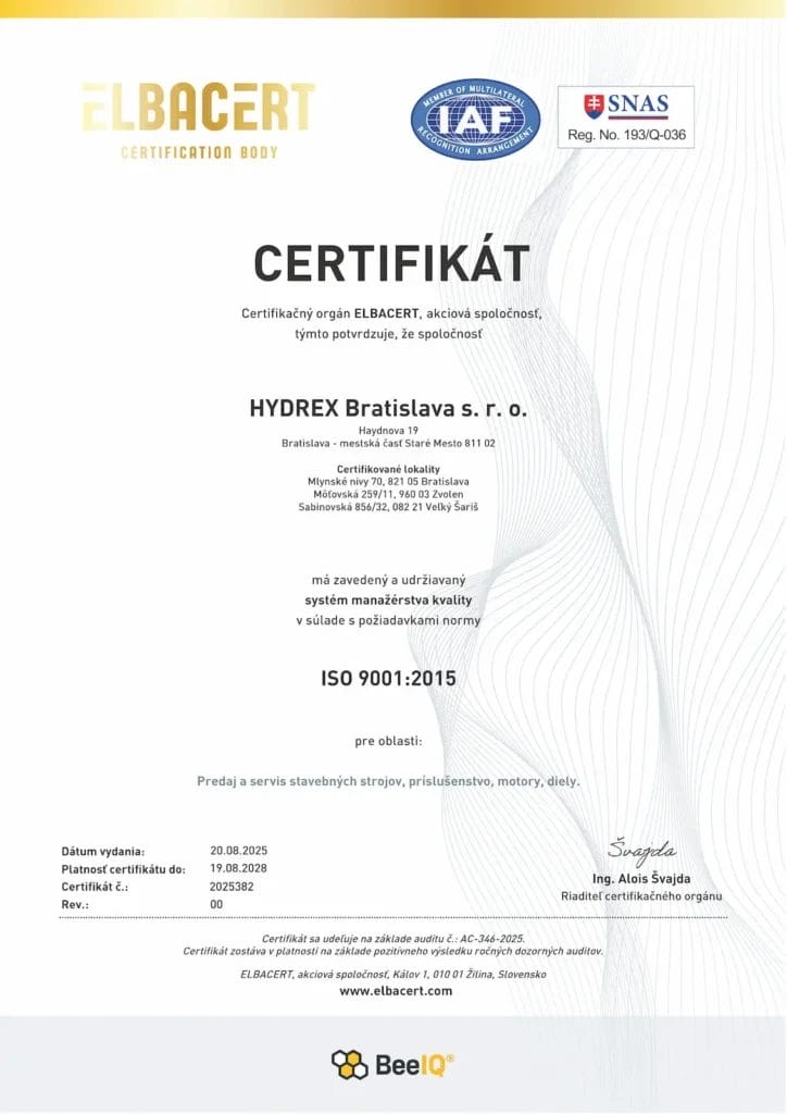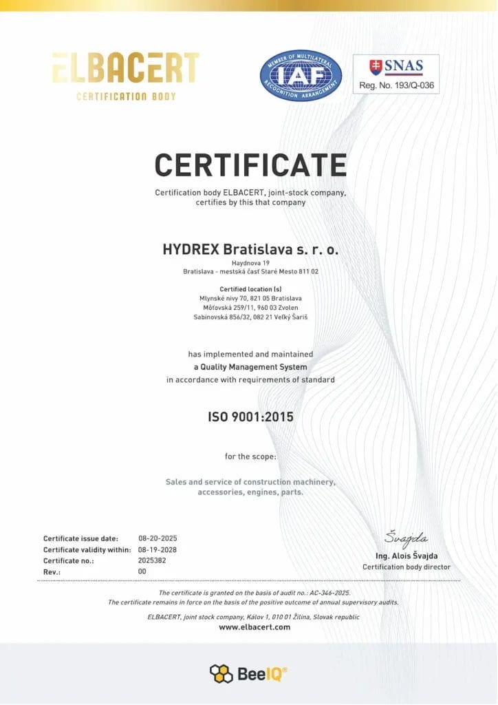 HYDREX Bratislava s. r. o. má zavedený a udržiavaný systém manažérstva kvality v súlade s požiadavkami normy ISO 9001:2015 pre oblasti predaj a servis stavebných strojov, príslušenstvo, motory, diely.